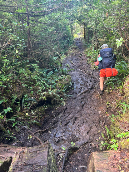 Right away, we found ourselves scrambling over, under, and around increasingly wet and slippery trees, rocks, and tangled roots taller than myself and thicker than my thighs. And somehow the rain continued to intensify as the hours wore on, turning the trail into a knee-deep muddy mess and completely soaking through our Gore-Tex shells and base layers.